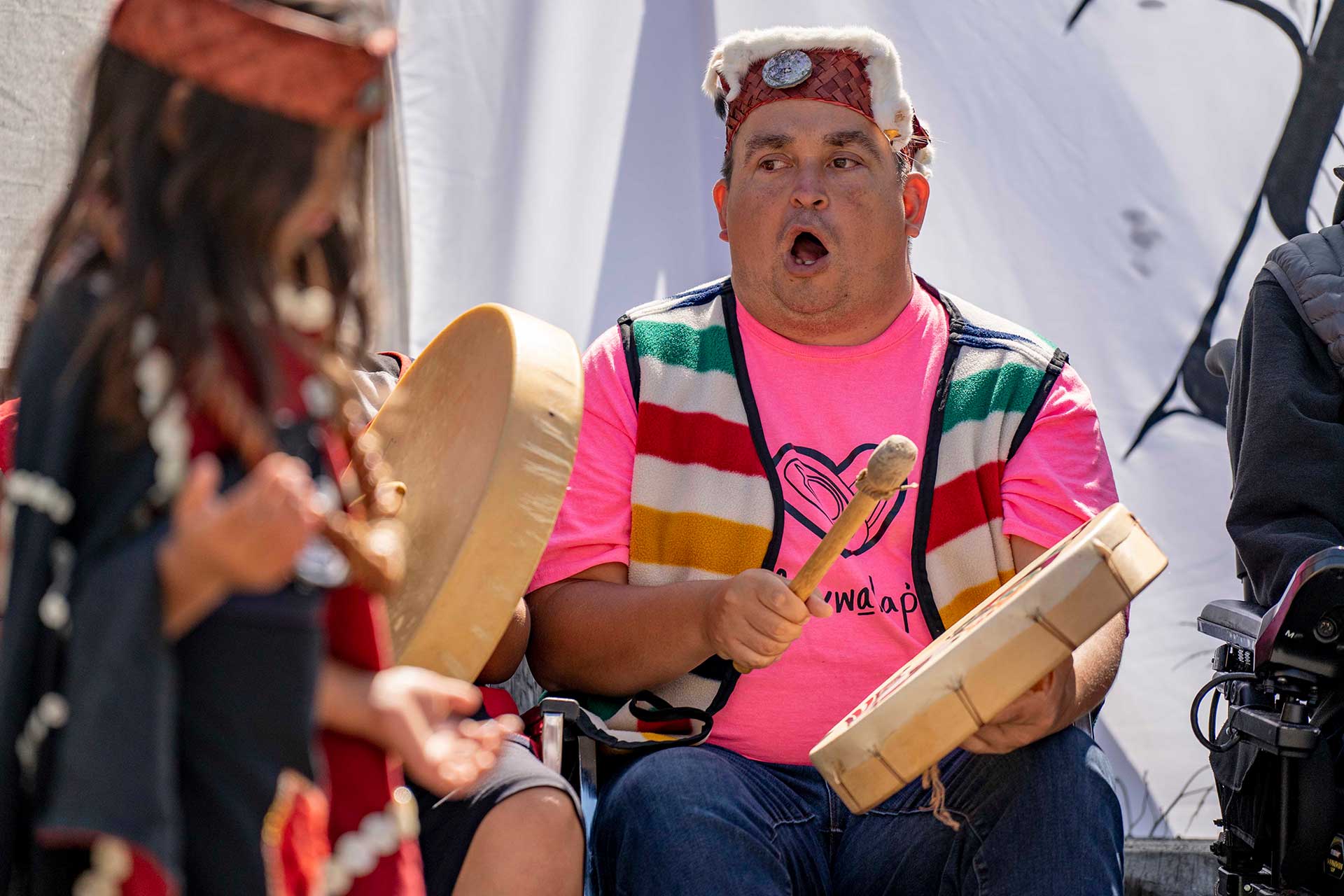 Potlatch ceremonies are a traditional gathering held by many First Nations groups in the interior western subarctic and on the Northwestern coast of Canada and the United States. For the Kwakwa̱ka̱’wakw people, the potlatch is used to mark every event of significance and to keep their history alive through the witnessing and oral retelling of cultural and spiritual practices. These vibrant ceremonies are a time of giving, pride, dancing, and showing of the masks.